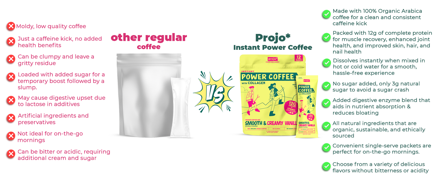 Projo* stands out from regular coffee by being a health-focused beverage that combines the rich flavor of organic Arabica coffee with functional benefits. Unlike traditional coffee, which provides no nutritional benefit, Projo* is infused with collagen protein, coffee fruit extract, 100% whole milk powder, and digestive enzymes, providing a balanced boost of sustained energy and enhanced nutrient absorption for optimal performance.